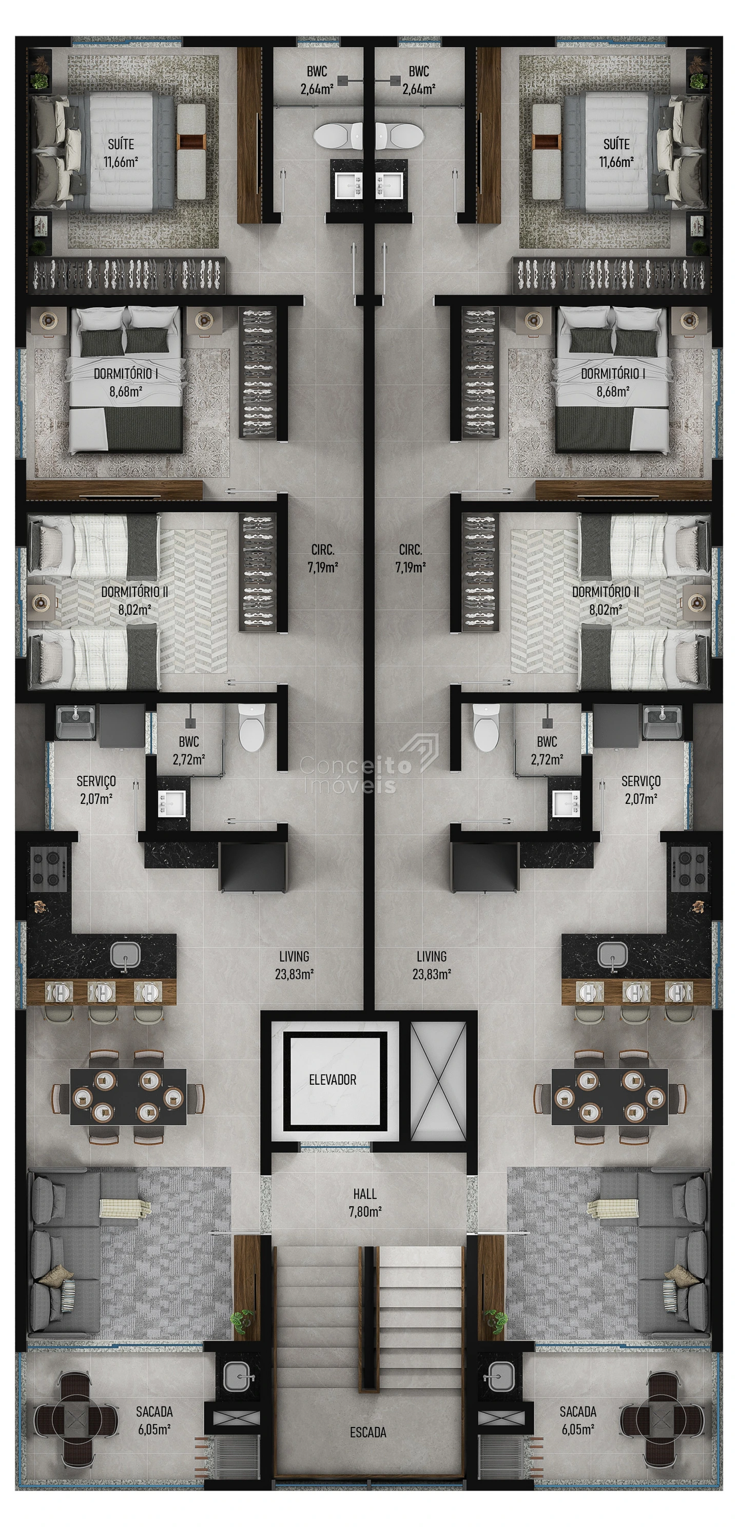 Cada ambiente foi projetado para maximizar luz natural, ventilação e sensação de amplitude, criando uma atmosfera de leveza e bem-estar.