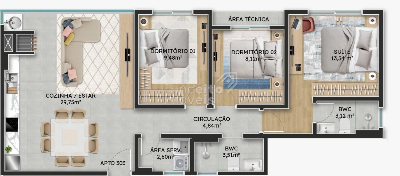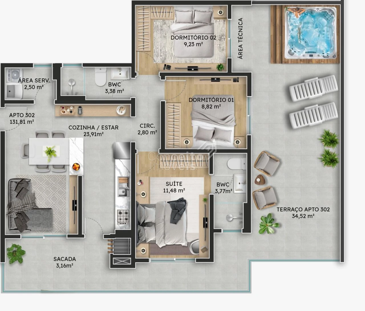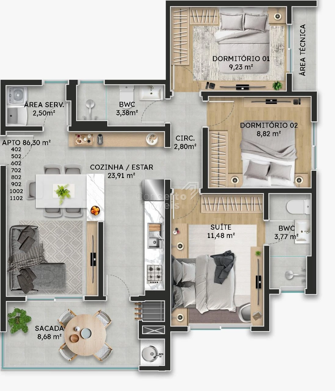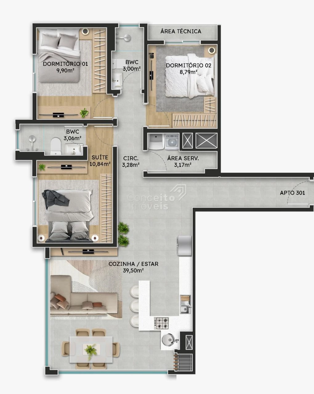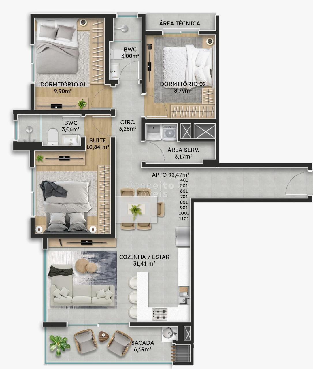 Cada apartamento do Green Coast foi planejado com layout inteligente e moderno, priorizando iluminação natural, ventilação e conforto térmico, além de permitir personalização e adaptação do espaço.