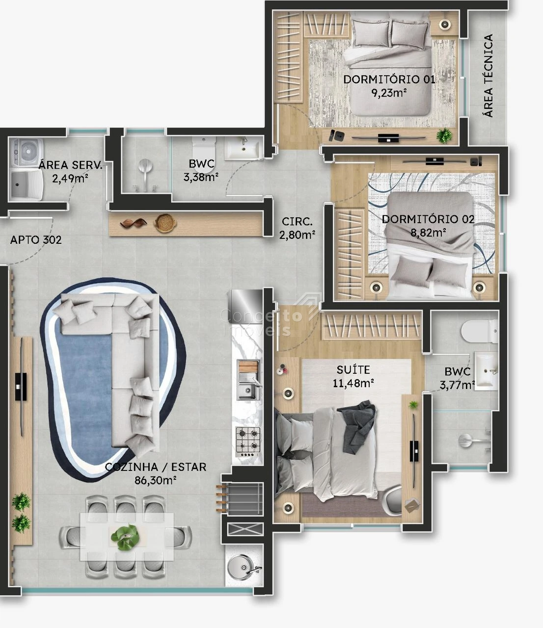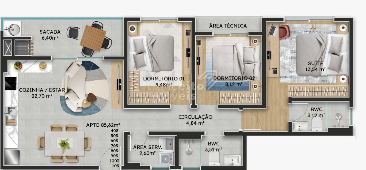 Acabamentos premium: piso porcelanato, rebaixo em gesso, esquadrias de alto desempenho, iluminação planejada 💡