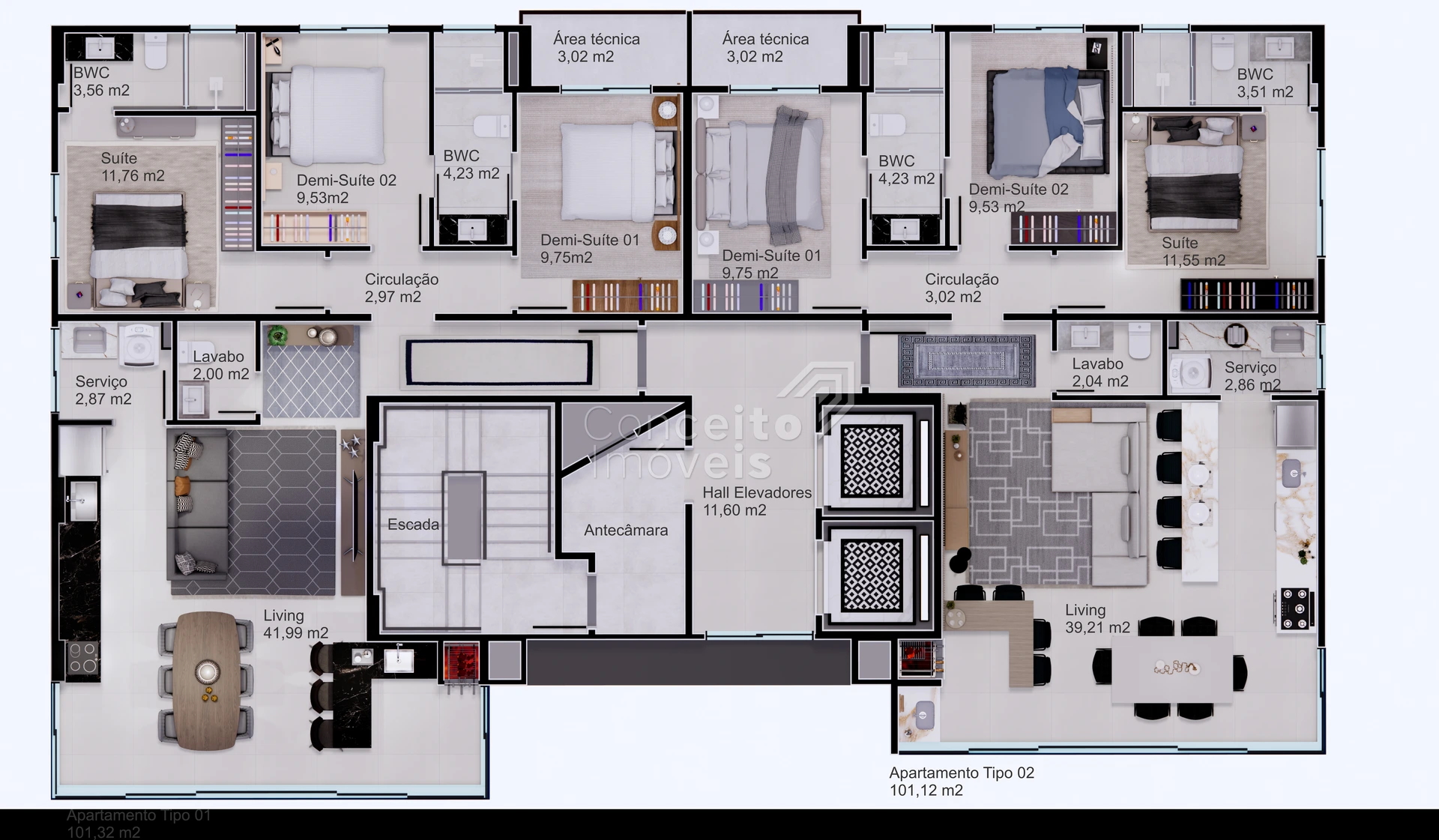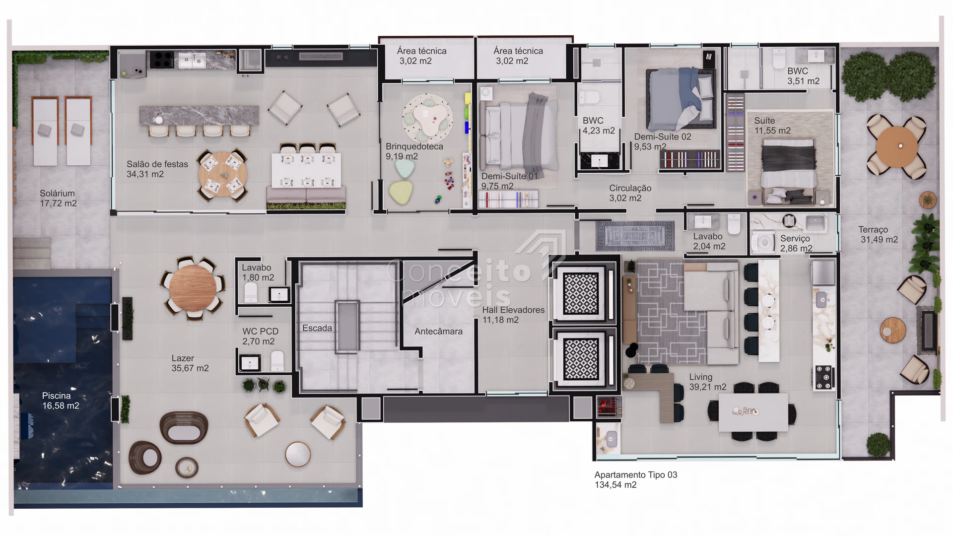 Unidades com 3 quartos, planta flexível e acabamento premium — perfil procurado por famílias, veranistas e investidores.