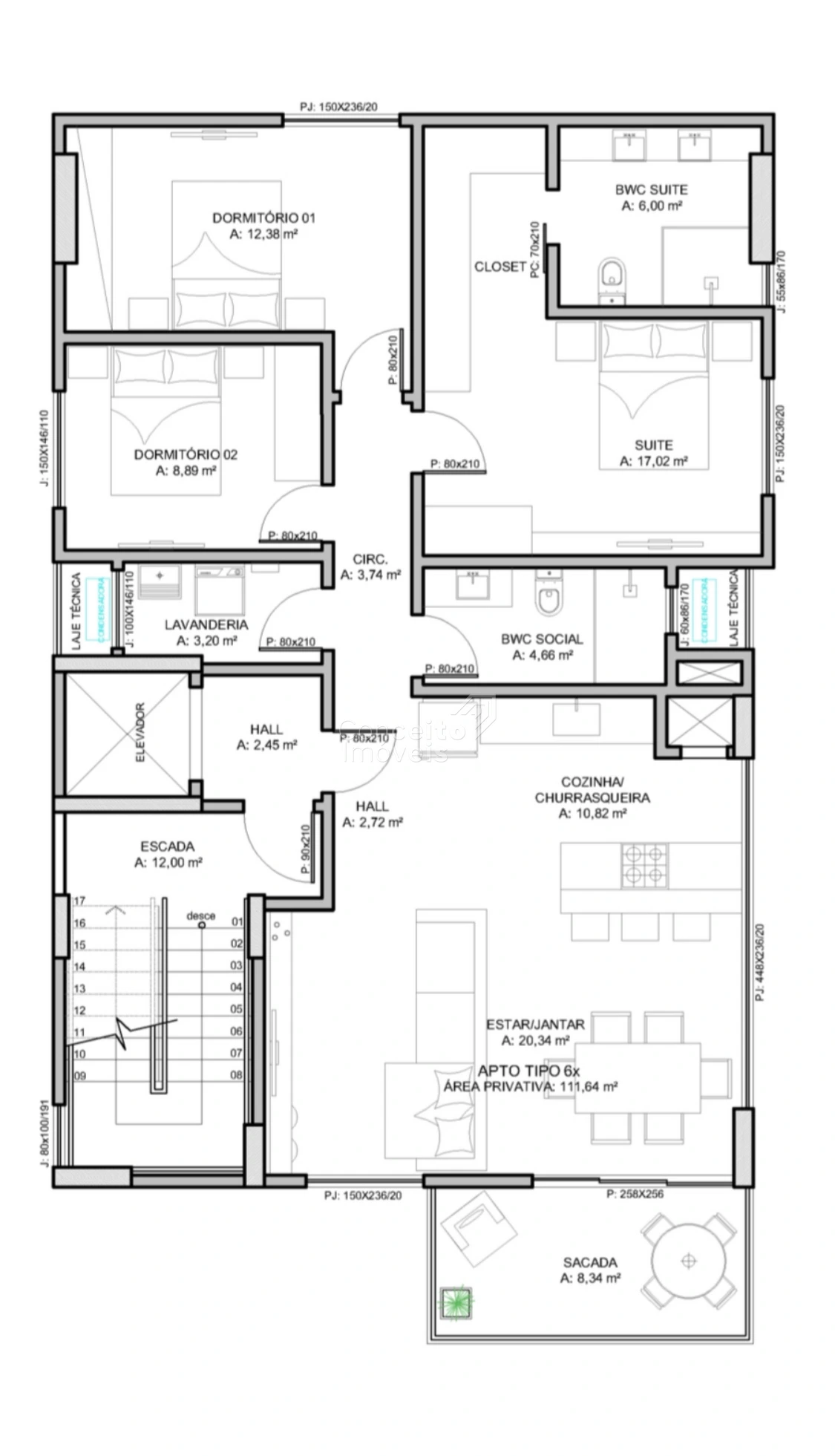 Apartamentos com 112 m² privativos, tipicamente com 3 dormitórios (1 suíte), área social integrada, sacada gourmet com churrasqueira e janelas panorâmicas, ideal para quem deseja maximizar a vista e a ventilação.