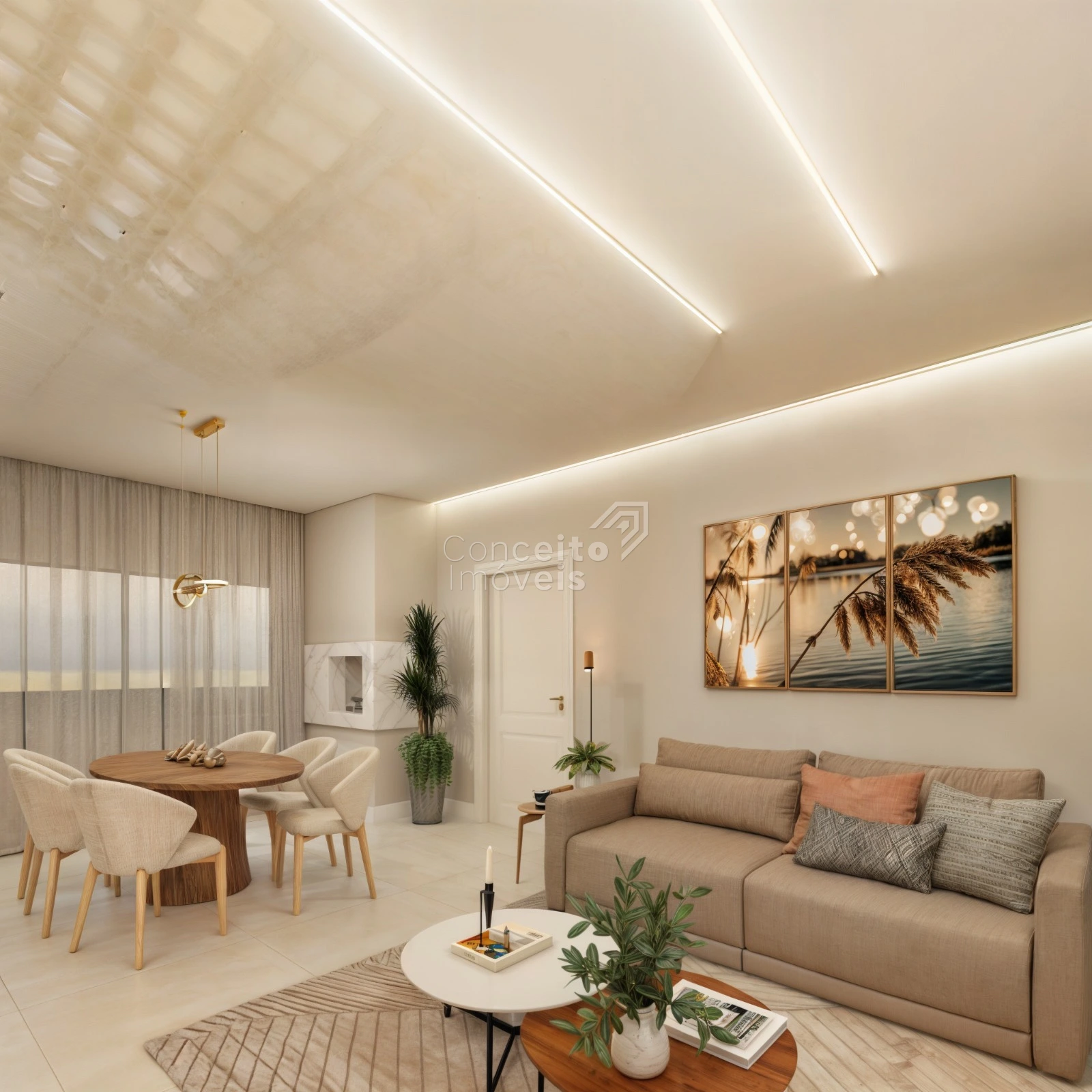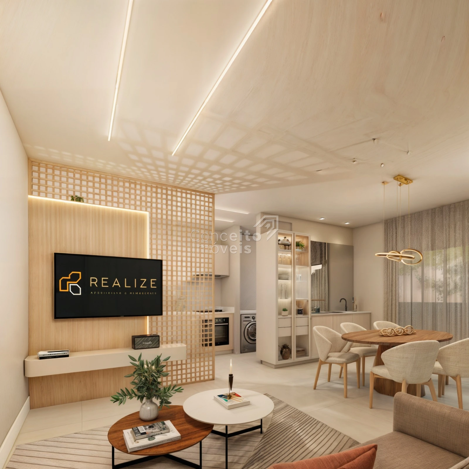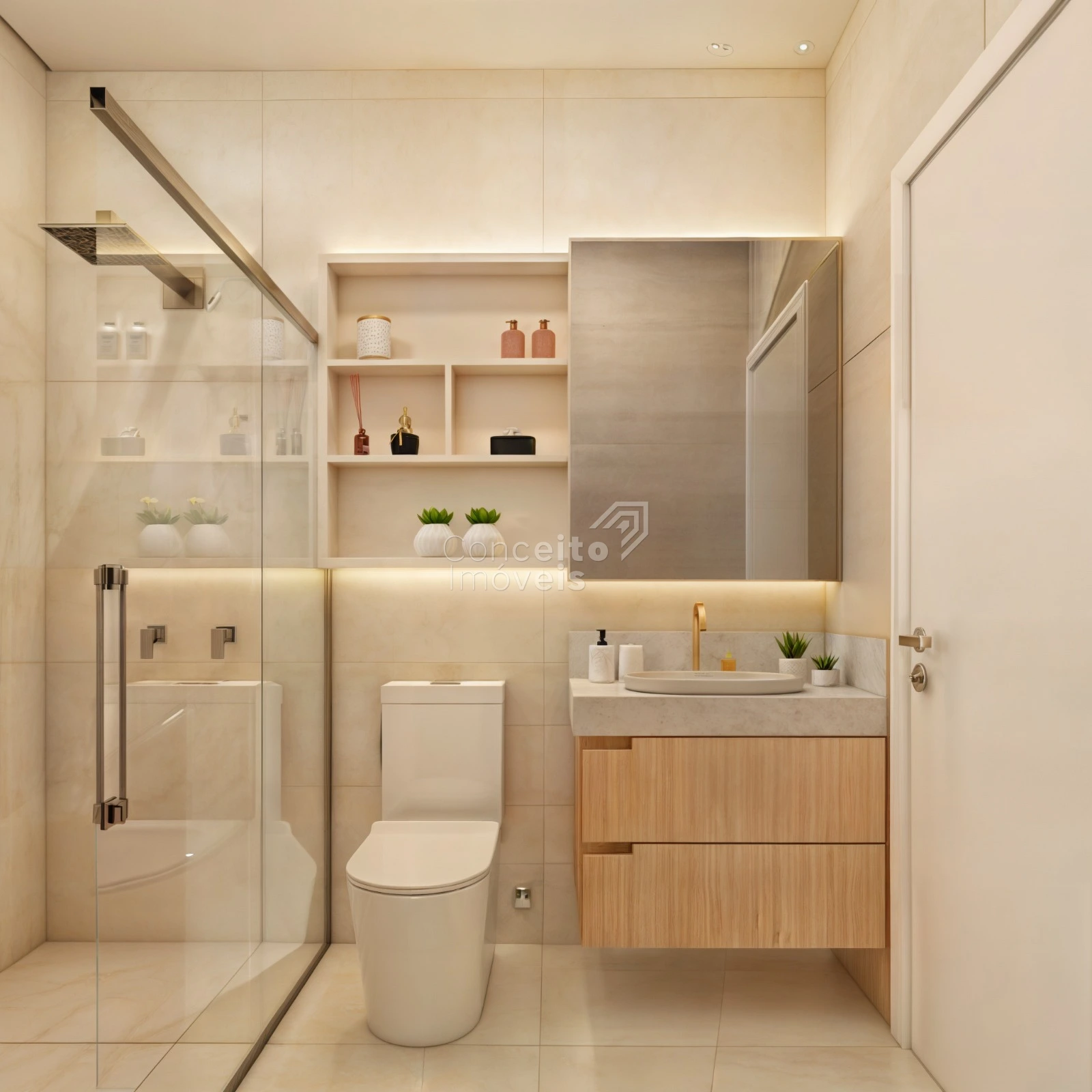 Acabamentos e padrão construtivo Piso porcelanato, rebaixo em gesso, infra‑estrutura para ar‑condicionado (split), acabamento moderno, preocupação com conforto térmico/acústico.