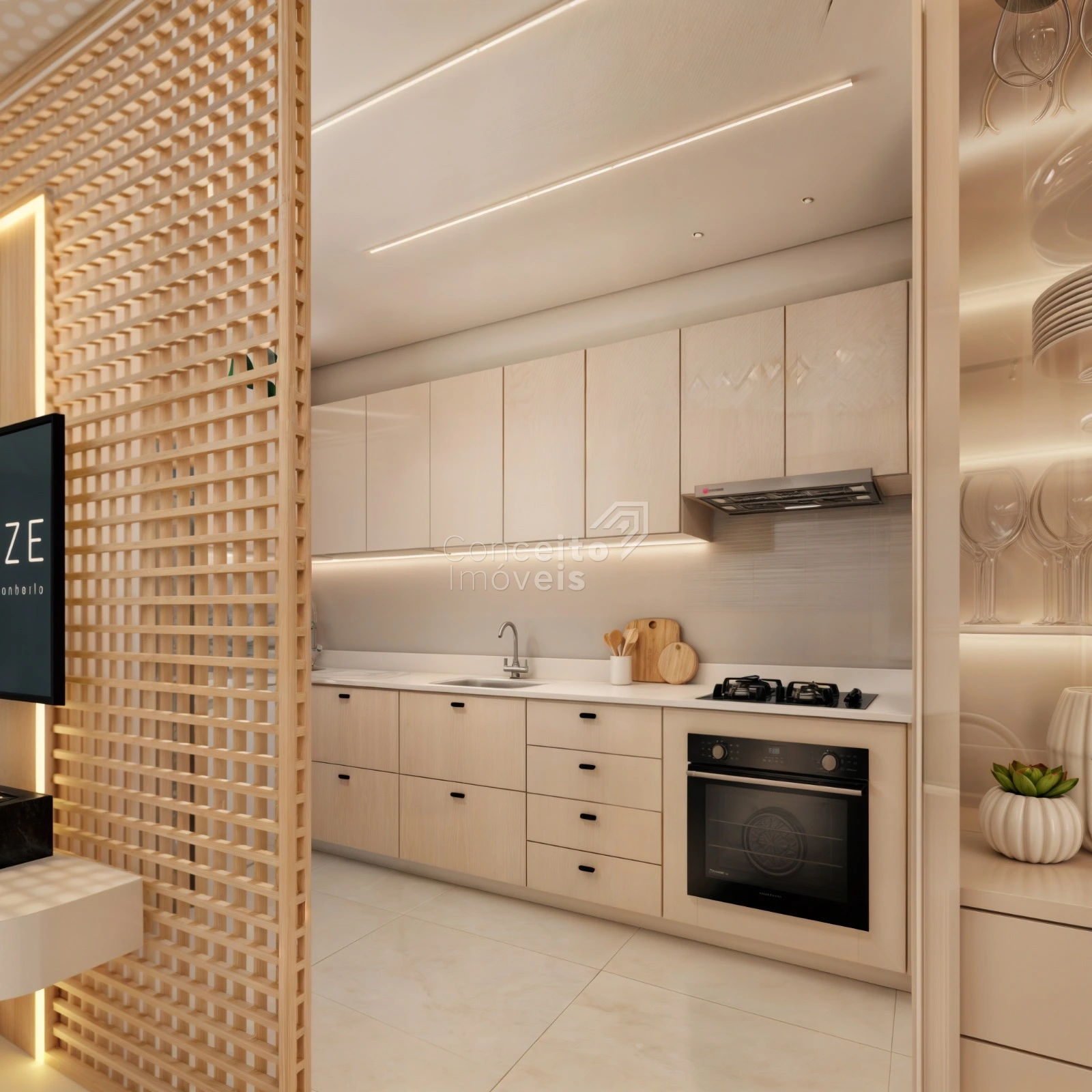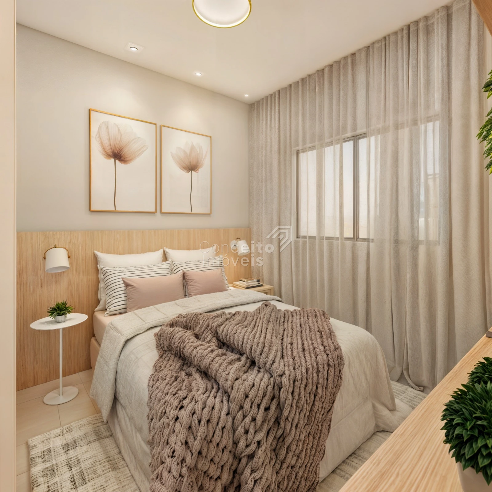 Configuração interna 2 dormitórios (sendo 1 suíte), banheiro social, living integrado (estar + jantar), cozinha, sacada/varanda (em algumas unidades), churrasqueira privativa, 1 vaga de garagem.