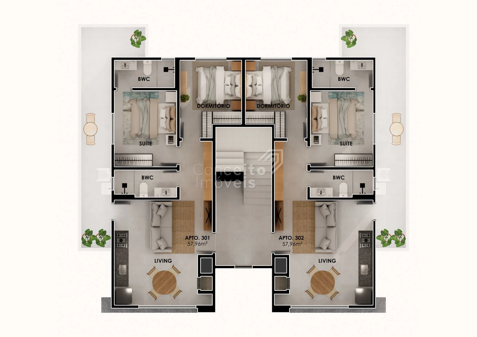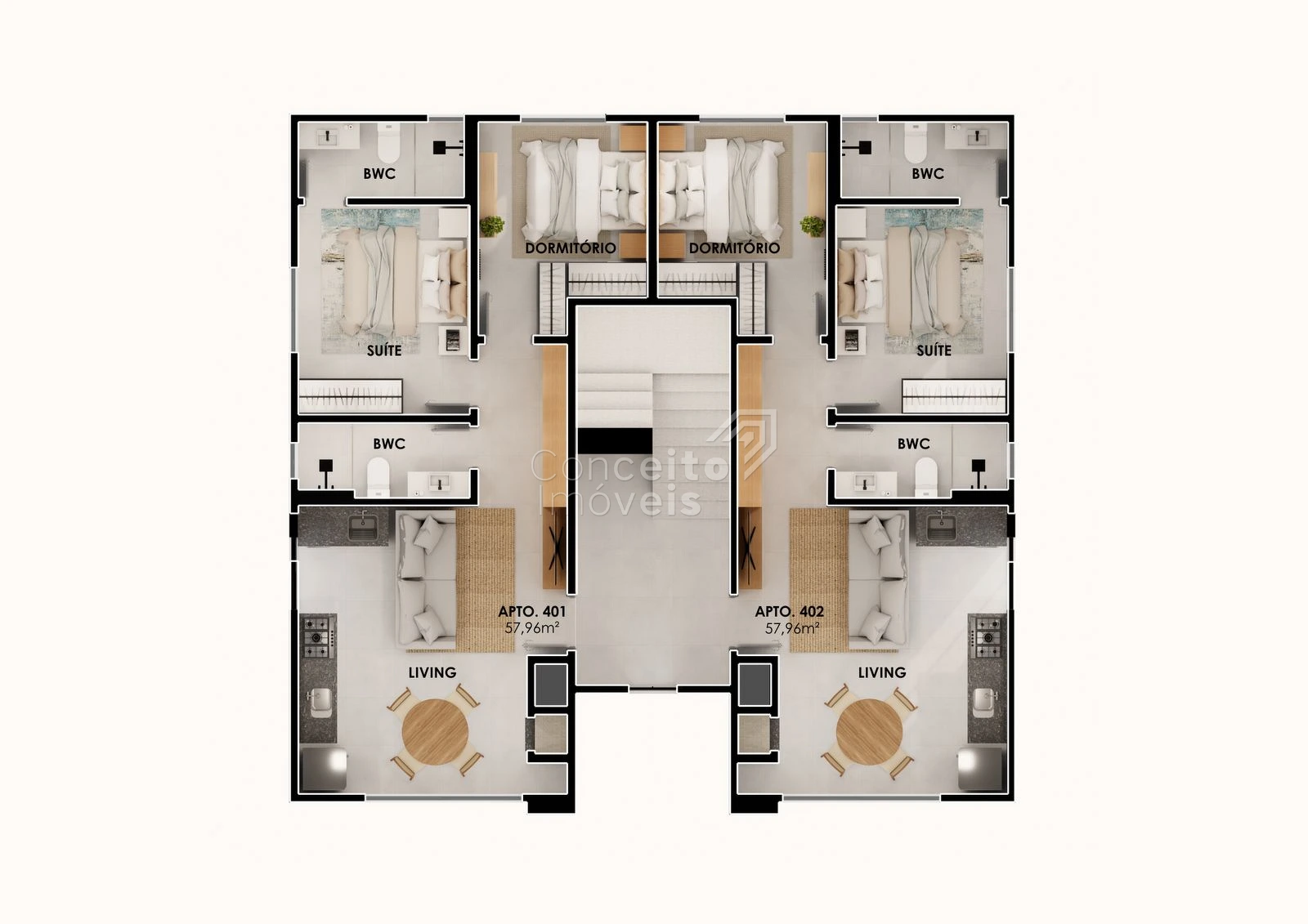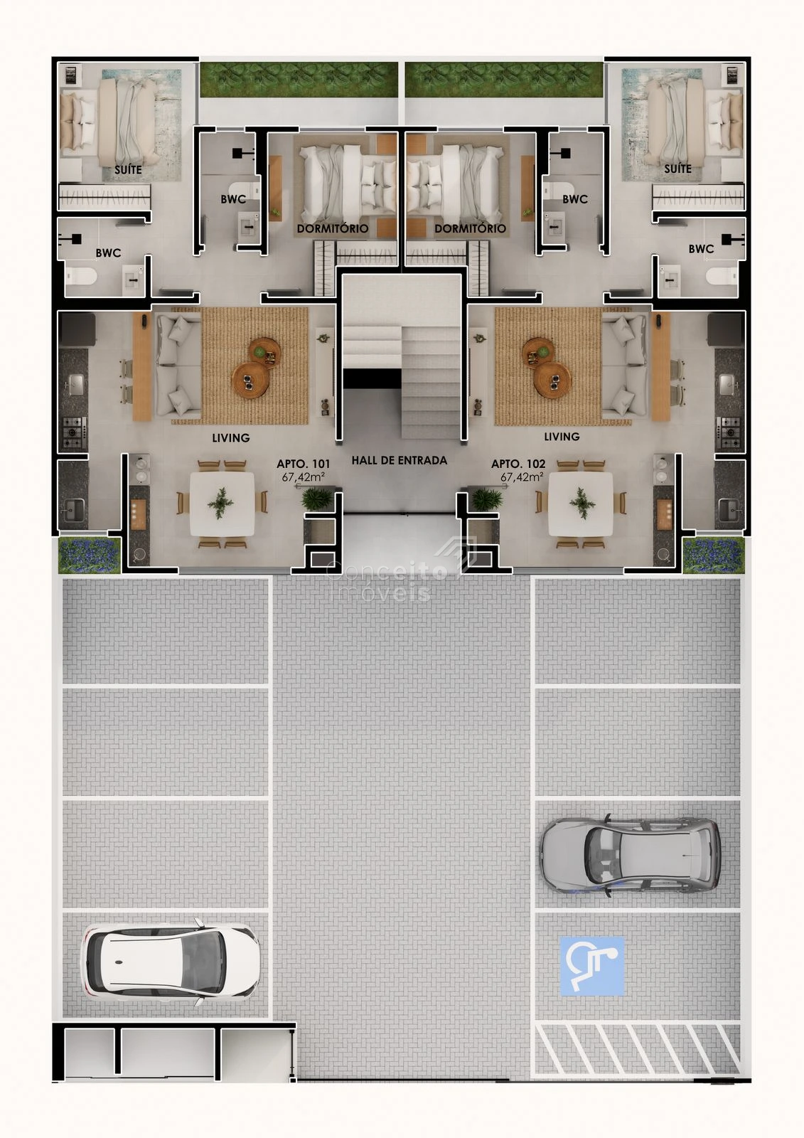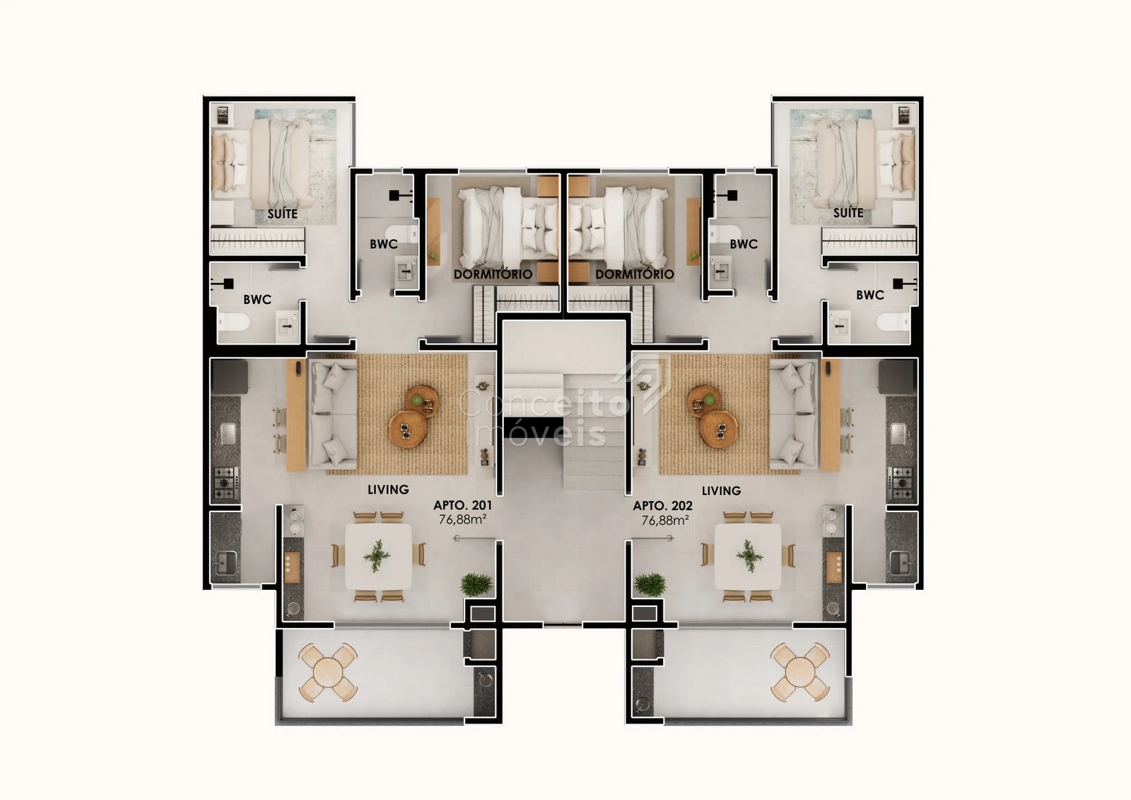 O projeto dispõe majoritariamente de apartamentos de 2 quartos, com: